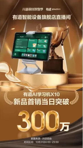 产品一经上市,「有道AI学习机X10」新品首销当日抖店销售额即突破300万,广受用户好评!