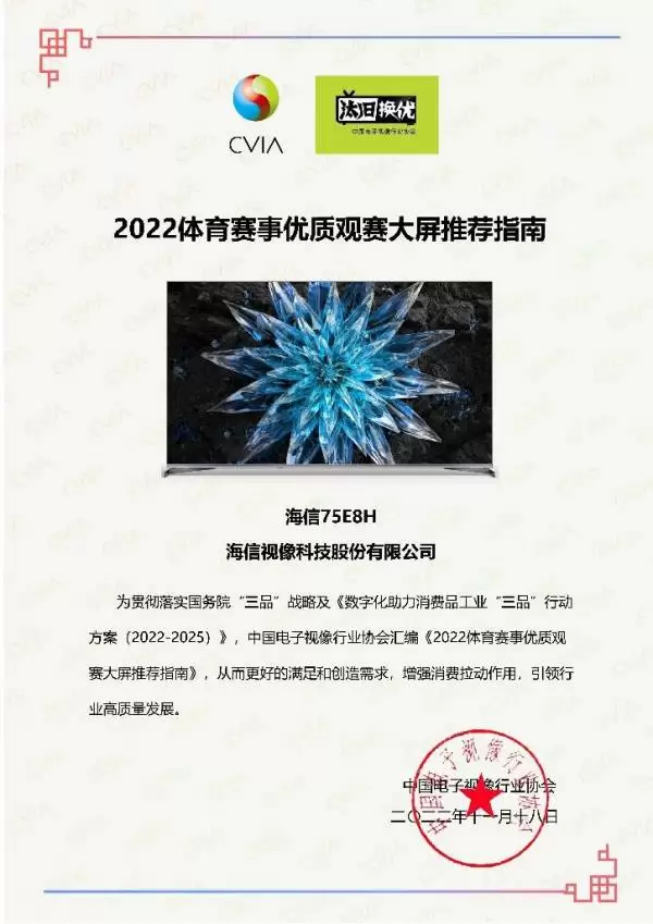 使用何种大屏显示设备才能更好享受这场全球足球盛宴?日前,中国电子视像行业协会联合京东家电举办的“2022体育赛事优质观赛大屏”评选结果公布,海信ULED X系列电视E8H以及激光电视88L9V、激光投影ViddaC1、东芝电视Z770MF等四款产品获评中国电子视像行业协会“2022体育赛事优质观赛大屏推荐产品”证书,受到视像协会重点推荐。