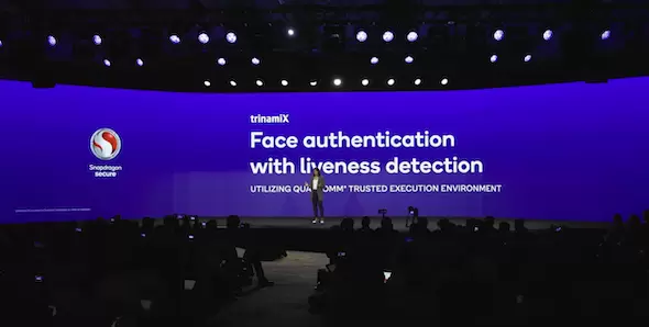 在安全功能的介绍中,高通专门展示了在最新第二代骁龙8原型机上运行的OLED屏下人脸认证的功能演示,通过搭载创迈思trinamiX人脸认证方案,现场的这台Android手机可以迅速安全的完成对于人脸的活体验证,并且演示机型没有过往3D结构光人脸认证机型中所存在的“刘海”设计,或是“高额头”与“药丸”。
