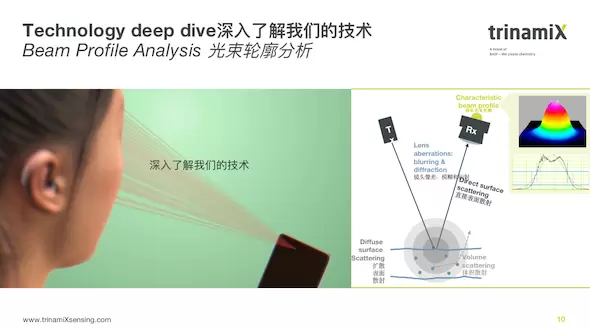 能够实现比当下苹果生态更加安全的人脸认证能力的关键在于该方案的核心原理为真肤检测。据悉该技术源自于巴斯夫在实验中的发现,并使之应用于移动设备领域,而创迈思也正是巴斯夫公司的全资子公司。活性检查基于创迈思的专利保护技术“ 光束轮廓分析” (BPA),能够检测出面前的人脸到底是活体皮肤,还是硅胶面具,检测中会向物体投射光束,光束到达物体表面后会散射回传感器中,从每个特定的光束轮廓中,算法提取关于被测物体表面材料的信息,就能实现对于活体真肤的甄别。