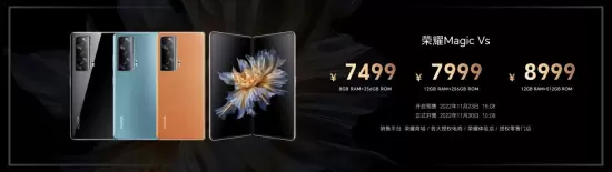 本次发布的荣耀Magic Vs系列包括两个版本:荣耀Magic Vs及荣耀Magic Vs至臻版,荣耀Magic Vs提供包括天青色、亮黑色,燃橙色(素皮)等三种配色,8GB+256GB版7499元、 12GB+256GB版7999元、12GB+512GB版8999元;荣耀Magic Vs至臻版 16GB+512GB售价10888元,提供凤羽金、亮黑色两种配色版本。荣耀Magic Vs系列将在11月23日 18:08在荣耀商城、各大授权电商及各授权门店预售开启,11月30日10:08,正式开售。