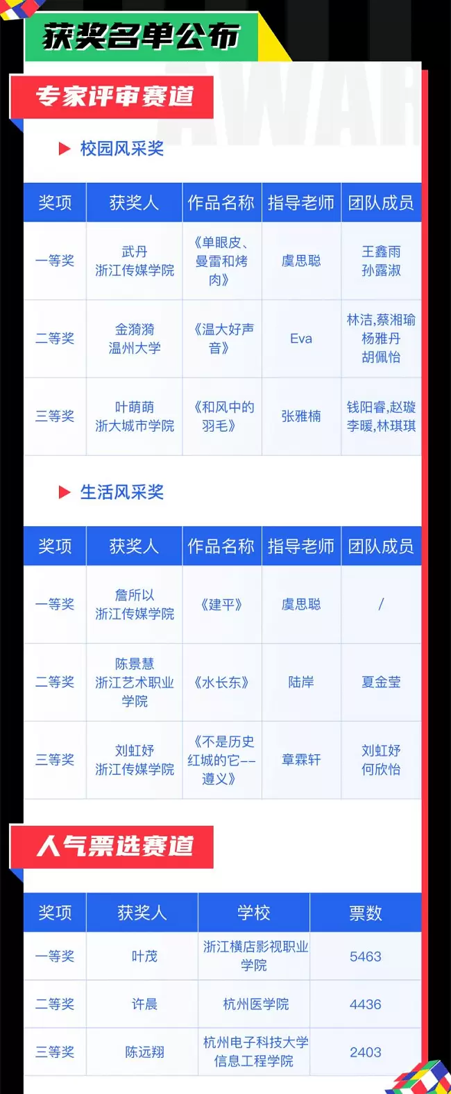 本次大赛参赛人数3000+人,收获作品3500+部,覆盖高校61所,投票人数 5w+人,投票次数 30w+次。参赛作品形式丰富,含vlog、视频剪辑、原创动画动漫、采访、口播等,学生原创内容中的观点表达展示了Z时代的新锐思考,刷新着内容表达可能性。