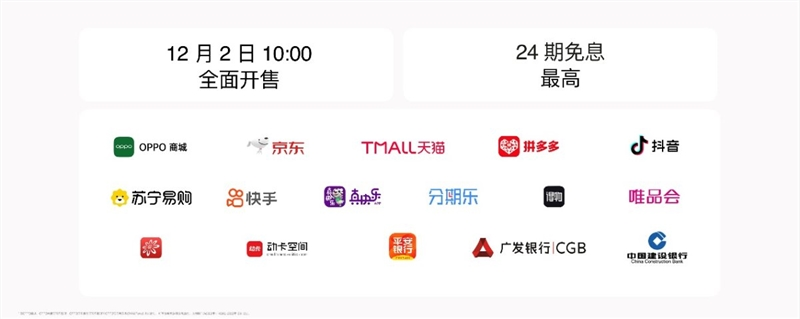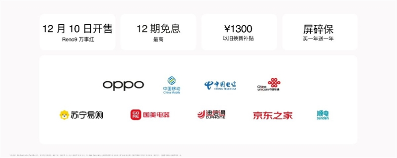 新品即日起接受预定,并将于 12 月 2 日上午 10 点在OPPO商城以及京东、天猫、苏宁、抖音等线上渠道全面开售,首销期间可享受最 高24 期免息。同时,OPPO体验店、三大运营商合作厅、苏宁、国美、迪信通、顺电等线下卖场将同步开售,首销期间可享受最 高12 期免息。 12 月 11 日前,在线下购买的用户可获得最 高1300 元以旧换新补贴,购买 1 年碎屏保将额外赠送一年有效期。此外,即日起至 2022 年 12 月 4 日,预订Reno9 系列16GB+512GB版本的用户,将有机会参与大内存免单计划。