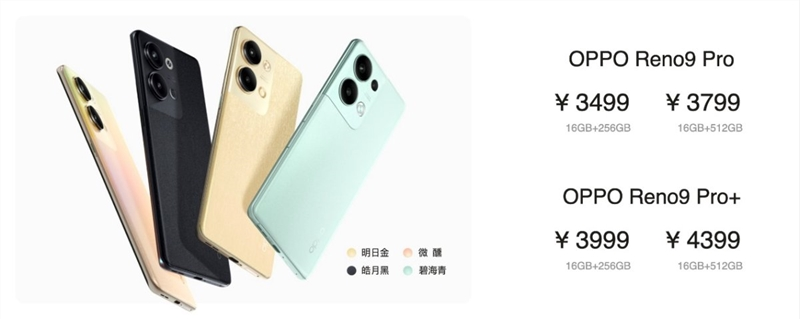 OPPO Reno9 系列提供Reno9 Pro+、Reno9 Pro与Reno9 三个版本。OPPO Reno9 Pro+提供明日金、皓月黑、碧海青三种配色,16GB+256GB版本售价 3999 元,16GB+512GB版本售价 4399 元;OPPO Reno9 Pro提供明日金、皓月黑、微醺三种配色,16GB+256GB版本售价 3499 元,16GB+512GB版本售价 3799 元;OPPO Reno9 同样提供明日金、皓月黑、微醺三种配色,8GB+256GB版本售价 2499 元,12GB+256GB版本售价 2699 元,12GB+512GB版本售价 2999 元。