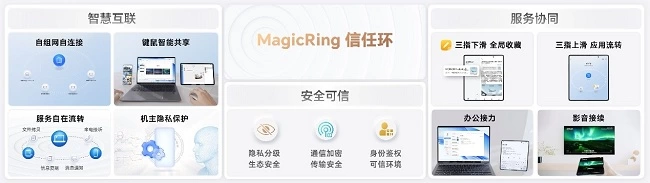 MagicOS 7.0全新发布的MagicRing信任环根技术带来了“键鼠共享、通知共享、通话共享、应用接续”等功能,相同荣耀账号的PC、平板和手机自动组成信任环后,可实现多设备跨端操作。