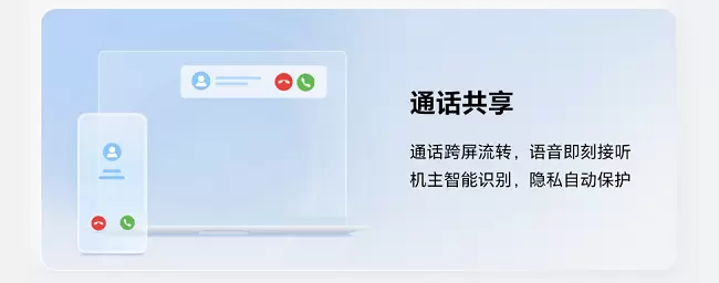通话跨屏流转,语音即刻接听:PC与手机互联后可接听附近手机同步过来的电话, 并支持在PC上拨打电话,免去了额外操作手机的烦恼,并支持机主智能识别保护隐私安全,实现服务跨设备随时随地可触达;