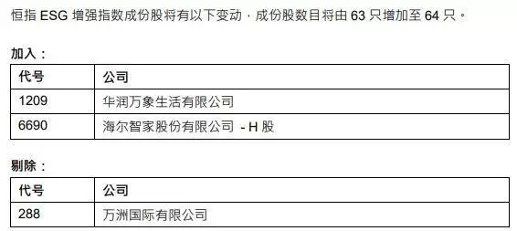 恒指ESG增强指数成份股数目将由63只增加至64只,纳入海尔智家、华润万象生活,剔除万洲国际。