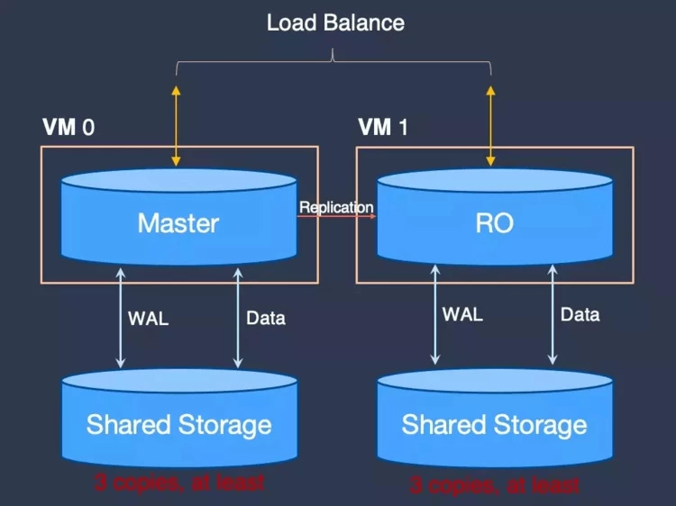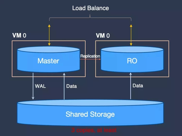 针对这些问题,可选解决方案是基于共享存储,即数据库共享存储方案:RDS 实例(一般指一主一从的高可用实例)和只读实例共享同一份数据。好处是实例故障或只读扩展时,不用拷贝数据,只需新建只读计算节点或把故障节点重新拉起来。并且,通过快照技术和写时拷贝解决数据备份和误操作恢复问题。不过,业内可用的共享存储方案非常少,即使可用,性能也达不到要求。