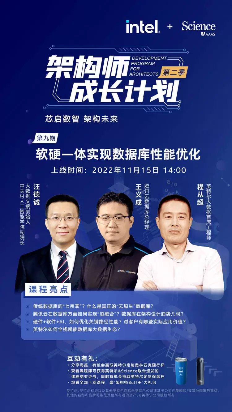 想了解更多关于数据库的知识吗?扫描下方海报二维码,预约观看英特尔联合国际学术期刊《科学》共同推出的“架构师成长计划”第九期《软硬一体实现数据库性能优化》,了解更多技术干货~