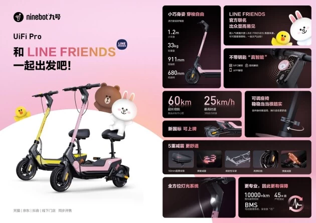 还有九号 X LINE FRIENDS联名的远行者F35车型。萌萌的外观,让人一眼就能get到宛如萌宠般的魅力。