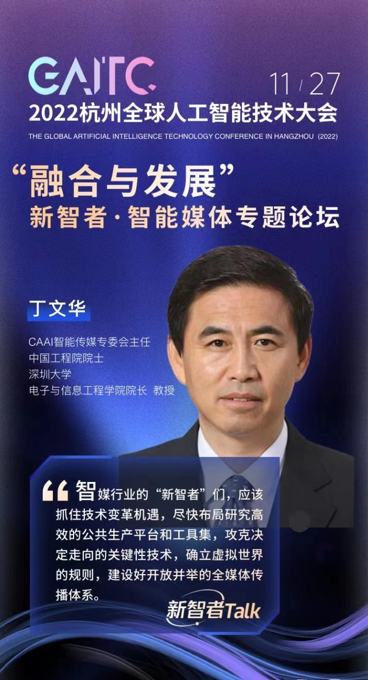 11月27日,在2022全球人工智能技术大会上,由CAAI智能传媒专委会、中国传媒大学媒体融合与传播国家重点实验室、新浪AI媒体研究院联合支持的“融合与发展”新智者·智能媒体专题论坛在线上举行。CAAI智能传媒专委会主任、中国工程院院士、深圳大学电子与信息工程学院院长、教授丁文华,CAAI智能传媒专委会副主任、微博COO、新浪移动CEO、新浪AI媒体研究院院长王巍共同担任论坛主席,与智媒领域的专家学者齐聚一堂,深入探讨了将人工智能更好地融入全媒体传播体系建设的方向和趋势。