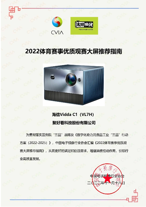 世界杯正在进行,对于不能前往卡塔尔现场的球迷而言,一个优秀的大屏显示设备至关重要。这不,贴心又专业的中国电子视像行业协会考虑到此,联合京东家电举办了“汰旧换优——2022体育赛事优质观赛大屏”评选活动。日前,评选结果已新鲜出炉了,海信激光投影Vidda C1、电视E8H、激光电视88L9V以及东芝电视Z770MF等四款产品入选《2022体育赛事优质观赛大屏推荐指南》。
