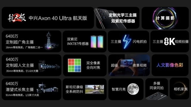 除全面屏外,以“直板旗舰终极形态”著称的中兴Axon 40 Ultra在影像能力上也完成了极致释放。航天版延续了Axon 40 Ultra的后置三主摄设计,配备三颗6400万定制光学主摄镜头,其中35mm人文主摄及超广角主摄均搭载索尼IMX787大底传感器,潜望长焦镜头支持OIS光学防抖,实现全焦段覆盖。不仅硬件条件出色,其定制的自适应快门影追算法、三主摄闪电抓拍、三主摄8K视频录制、预设对焦等功能,也进一步展现了中兴强大的计算摄影能力。