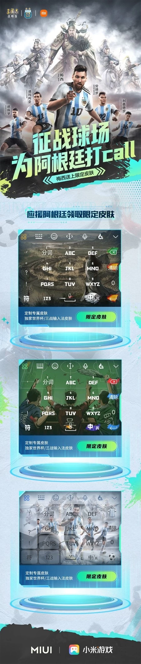 世界杯期间,绿茵场上不仅演绎着扣人心悬的紧张与激动,更不乏足坛“顶流”球员的悉数亮相。在这激情时刻,讯飞输入法小米版皮肤商店上线了“为阿根廷队助威”的限定皮肤,相当于为自己的输入法披上“战衣”,表达对阿根廷队和梅西的支持和喜爱;场边球迷的热情欢呼一直是球员无穷斗志的源泉,为此讯飞输入法小米版为球迷推出“一起来看世界杯”的限定皮肤,增强观看和讨论赛事的体验。值得一提的是,讯飞输入法小米版还独家定制了“三国志专属皮肤”,吸引游戏玩家同时又是球迷氪一波金,秀出足球情节。