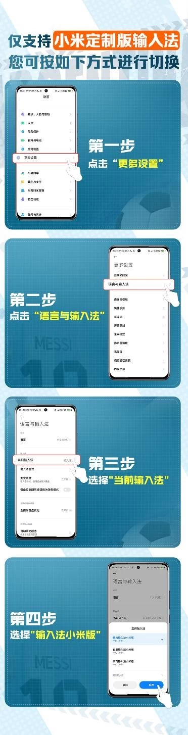 如果小米手机用户还没有用上讯飞输入法小米定制版,首先进入设置-更多设置,从语言与输入法中选择当前输入法一栏,点击使用讯飞输入法小米版,然后再进入皮肤商店就能pick自己喜爱的世界杯限定专属皮肤。