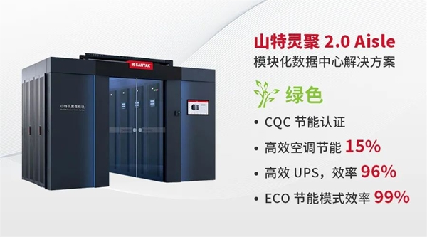 山特灵聚 2.0 Aisle,是一款完全基于通道设计、采用模块化等先进技术研发的高性能解决方案,可提供 10-40 柜位的通道部署,功率最大可至 200kW,有效匹配 IT 设备的高密度演进。同时,利用高效空调及模块化 UPS 使 PUE 更低。相较于传统数据中心,具有易部署、易扩展、高兼容性、高可靠性、低能耗、低空间占用等多种优势。