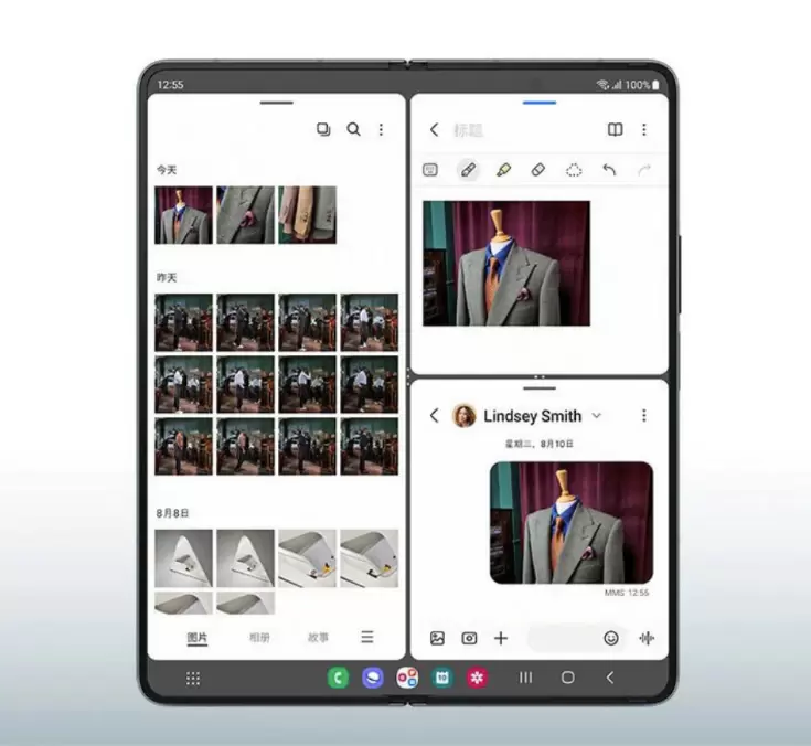 为观影、游戏用户带来更舒适畅快的视觉观感,早已不是三星Galaxy Z Fold4唯一使命,自2019年初代三星Galaxy Fold“出世”以来,便吹响了推动“移动生产力”的号角。经过四代产品的不断改进,三星Galaxy Z Fold4已实现折叠形态与软件应用融为一体、共同协作的境界:崭新的任务栏布局,当用户需要打开新的APP时,无需回到主屏,点击任务栏上的图标,即可开启;更有手势快捷分屏功能,同时开启多达3个窗口,可以像PC般进行多任务处理,工作效率直线上升,完美展现折叠屏的出色表现,为移动办公带来的高效与便捷!