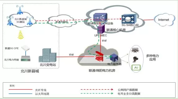 项目位于四川绵阳北川新县城,国网北川供电所现有约50个配网自动化点位。由于配网点位固定、施工中断、运维成本高等因素,导致光纤网络承载的配网自动化业务难以实现柔性调整。有线、WIFI和4G等网络难以有效满足综合性能需求,5G专网的大带宽、低时延、高可靠特性等内生能力与电网业务需求高度契合,可实现传输低时延、快速响应和数据私密性等优良性能,为配网自动化系统安全稳定运行提供更优质的保障。