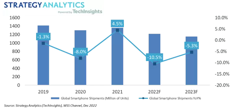 Strategy Analytics无线智能手机战略(WSS)服务最新发布的研究报告指出,2022年全球智能手机出货量将同比下降10%。下行轨迹将持续到2023年,但年增长率将改善至-5%。全球智能手机出货量将达到2014年以来的最低水平。对于整个行业来说,这是一个非常艰难的时期。