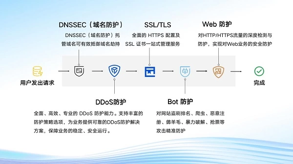 在安全方面, EdgeOne整合了腾讯20多年积累的安全防护产品,包括Anti—DDoS、WAF、BOT、CC等。