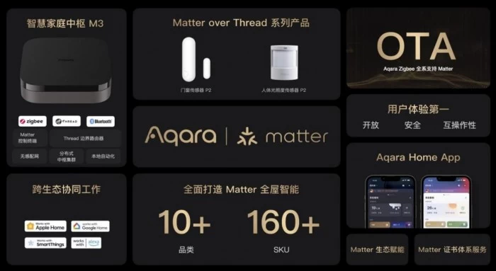 会上,Aqara再次强调全系列 Aqara 的网关可以通过 OTA 升级支持 Matter,用户无需购买新设备,仅需将手中原有的网关设备,如:Aqara 网关 M2,Aqara 网关 M1S 升级固件后即可支持 Matter,并让子设备也支持 Matter,体验到真正的万物互联。