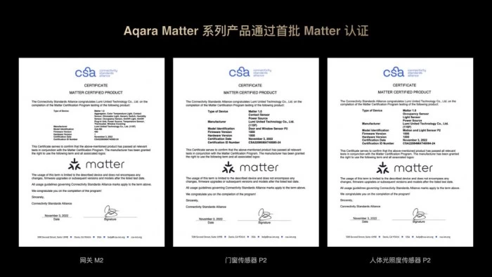 此外,Aqara已成为首批获得Matter认证的品牌之一,目前Aqara网关M2、门窗传感器 P2、人体光照度传感器 P2 已通过 Matter 认证,进一步推进了 Matter 协议在全球的普及和落地。