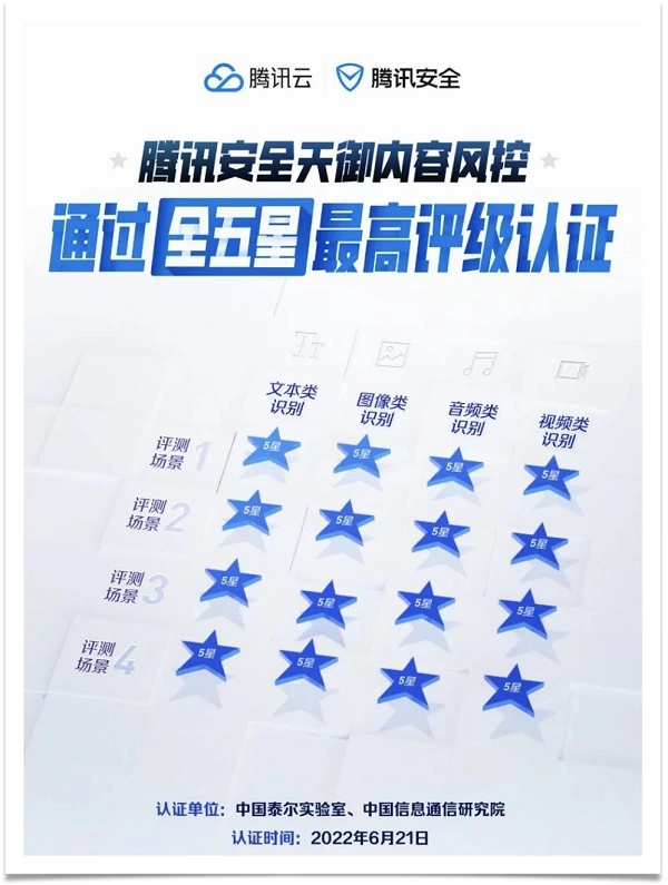 腾讯安全天御内容风控系统新版本今年六月份通过了中国信托院组织的专业评测,在文本、图像、音频、视频四大类型的 16 项场景评测中均为满分,斩获“全五星”最高评级。