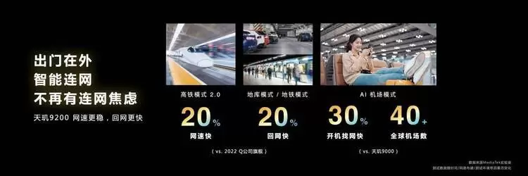 在各种差旅或旅行的场景中,难免会碰到5G信号覆盖不全、信号被遮挡等情况。天玑9200集成的5G调制解调器可结合AI人工智能技术,提供5G智能出行体验,包括高铁模式2.0、地库模式/地铁模式、AI机场模式,支持全球40余个机场。通过5G智能出行模式,天玑 9200实现了“找网快、回网快、网速快”,用户不管身处何地,都能畅享5G网络连接,彻底解决了“连网焦虑”。