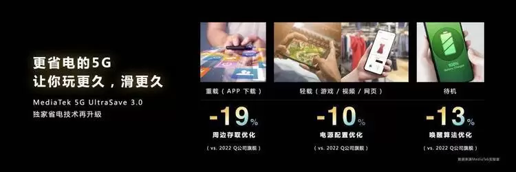 联发科的5G UltraSave省电技术已经升级至第三代UltraSave 3.0,在5G连接场景中,UltraSave 3.0通过周边存取优化、电量配置优化,以及唤醒算法优化,全面降低功耗,覆盖APP下载等5G重负载场景,游戏、视频、网页等5G轻负载场景以及5G待机场景,再度印证了高能效已成为天玑芯片的基因级优势。
