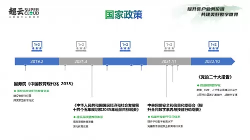 会议开场,超云技术支持中心总经理乔鑫围绕行业发展现状、国家贴息政策等维度,向与会专家做详细阐述。乔总表示,自2019年2月,国务院发布《中国教育现代化2035》纲要以来,中国教育的数字化与智能化变革就一直处于提速阶段,2021年3月发布的《十四五发展规划和2035愿景目标纲要》与今年的相关政策更是将教育改革推向新的高度,全面建设数字教育2.0,已经成为新的发展目标。