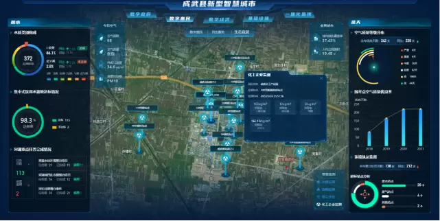 成武新型智慧城市平台通过与现有化工园区监管平台对接,实现化工园区重点企业实时监控,重点气体指标实时监控。例如,“工地扬尘”应用可显示建筑工地分布情况,以及各工地PM10、PM2.5、温湿度等数据,数据超标即触发告警,有效治理建筑工地空气质量问题,每周或每月会输出近期频繁告警的工地排名,辅助住建局开展排污整改。目前,成武扬尘治理成效在菏泽市排名前三。