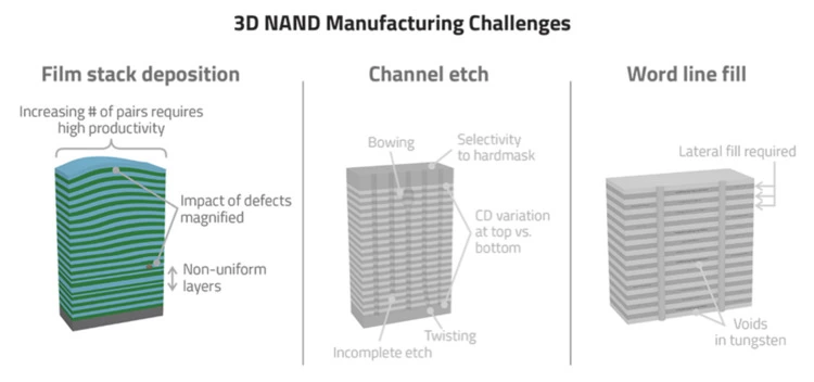 业内对3D NAND堆叠层数的不断追求来源于市场对单芯片存储容量需求的不断提升。由于芯片的微缩化已经接近2x nm性价比极限,通过实现存储单元在垂直方向的层层堆叠,就可以大幅度提升NAND芯片的性能和存储密度。业内预测,在2025年左右3D NAND会达到500层,而在2030年左右达到800层。