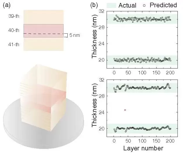 在晶圆膜厚量测过程中,基于薄膜神经网络的测量结果与国际量测标准的数据进行对比,误差在万分之一以内(<0.1 nm)。这一结果证明了该技术在晶圆级薄膜厚度测量场景中的可行性。