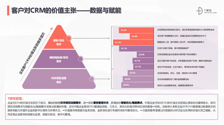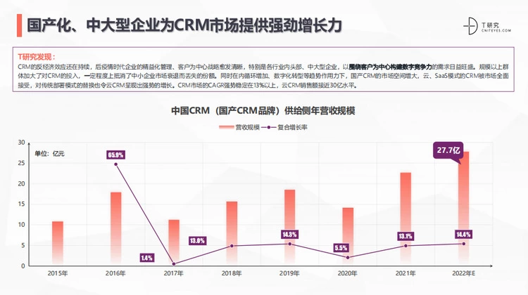 近日,T研究根据近500家企业用户实际使用,15家供应商摸底调研,梳理最真实的市场供需两端异同,发布本年度SaaS产业最良心的报告《2022中国CRM全景产业研究报告》。