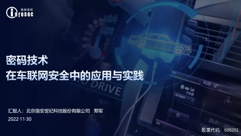 2022年11月30日,为探讨密码技术在车联网领域的应用和协同创新,由工信部密码应用工作组主办、北京信安世纪科技股份有限公司(以下简称:信安世纪)牵头组织了以“密码在车联网领域的应用”密码技术沙龙活动。会上,信安世纪车联网技术专家郑军发表了以《密码技术在车联网安全中的应用与实践》为主题的分享,从车联网概述、商用密码概述、应用场景分析、应用实践及思考四个方面,阐述了信安世纪在车联网密码应用方面的技术研究与应用实践。