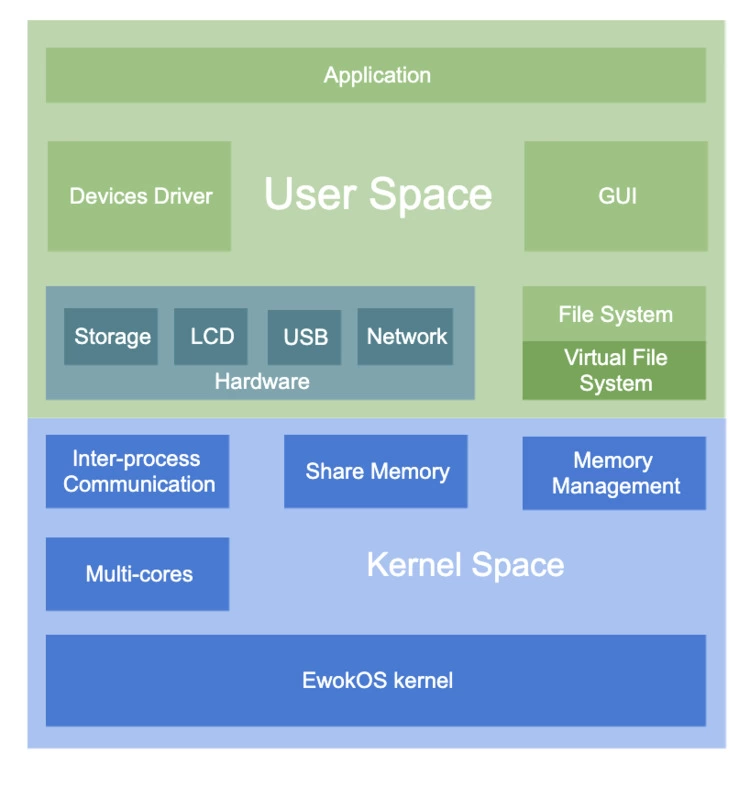 区别于传统宏内核操作系统,EwokOS构建了一个和硬件无关的内核模式,内核状态下仅处理IPC、进程调度、内存管理等核心任务。这使内核模式的代码高度精简、高效。如果需要,甚至可以把EwokOS内核的放入高速cache中运行。