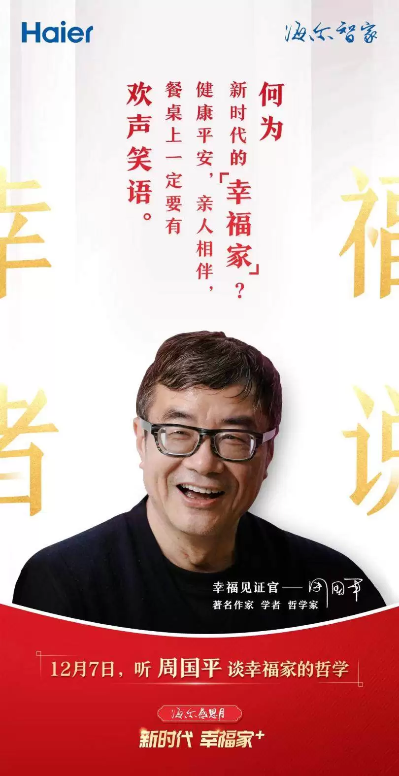 12月7日,正值海尔感恩月期间,海尔智家联合中国当代著名作家、学者、哲学家周国平深入解读什么是新时代幸福家。作为海尔超级用户和幸福见证官,周国平讲到,大家要珍视身边的幸福,珍惜身边的人和事,并借海尔感恩月表达“心怀感恩,幸福长在”的哲思,说明新时代的幸福家与感恩同行。这与海尔感恩月通过为用户升级幸福家,让用户每天都是幸福日的理念不谋而合。