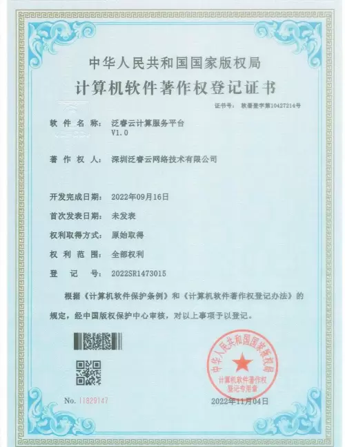 软件著作权是企业核心自主知识产权,是企业的“无形资产”,是企业科技的生命力和价值所在,国家权威部门的认证将使其搭载的产品价值倍增。此次泛睿云获得国家认证的计算机软件著作权,充分展现了企业雄厚的研发实力和核心竞争力。