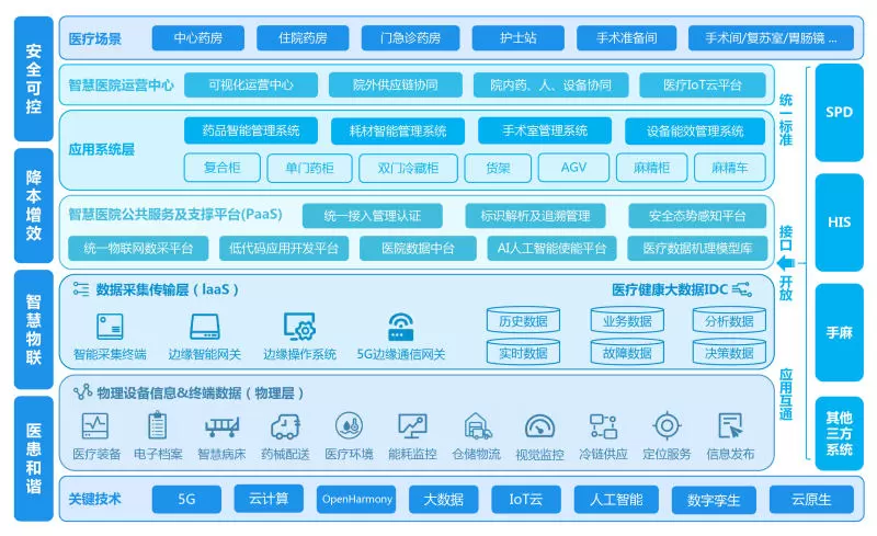 根据合作内容,润和软件与天奥智能充分发挥双方自身的能力与资源优势,围绕国家重点医疗发展领域的安全自主可控数字化转型的需求,共同打造了基于OpenHarmony的智慧医疗综合解决方案。该方案整体上从医疗器械/药品/耗材管理、医疗数据、智慧终端、院内物流配送等多个维度出发,基于国产操作系统、云计算、AIoT、大数据、AI等前沿技术,由下而上包含设备物理层、边缘接入层、支撑平台层、系统应用层、运营管理层五大管理层级,为医院带来七大核心价值: