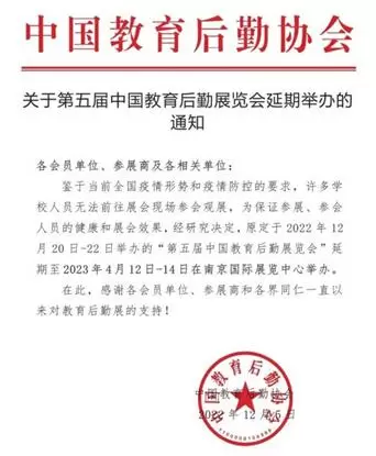 鉴于当前全国疫情形势和疫情防控的要求,许多学校人员无法前往展会现场参会观展,为保证参展、参会人员的健康和展会效果,经研究决定,原定于2022年12月20日-22日举办的“第五届中国教育后勤展览会”延期至2023年4月12日-14日在南京国际展览中心举办。