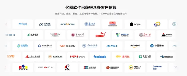 目前亿图软件已与国内知名企业阿里巴巴、比亚迪、科大讯飞、中国南方电网等达成合作,来自科技、金融、教育、互联网、咨询等各个行业,也与复旦大学、深圳大学、南方科技大学、首都医科大学等知名院校进行合作。凭借多年在图形可视化领域积累的经验,亿图已经成为国内外专业的绘图创意类软件提供商 ,覆盖全球150个国家和地区。拥有17 年复杂信息可视化领域技术的积累,是国产创意绘图软件领域的先驱者。