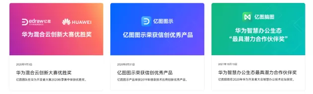 近年来,亿图软件全面适配国产计算生态,加码企业级服务,先后荣获“华为混合云创新大赛优胜奖”、“信息技术应用创新优秀产品”、“鼎信杯信息技术应用创新优秀应用软件奖”等称号,在今年的华为开发者大会2022上还荣获“华为智慧办公最具潜力合作伙伴”称号。