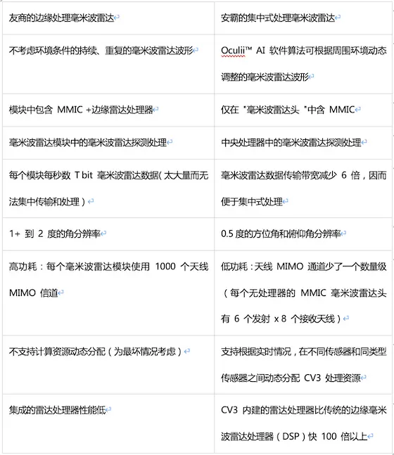 新款集中式架构的优势还包括更容易进行 OTA 软件升级,以便未来不断改进和适应新需求。相比之下,在确定每个模块使用的处理器和操作系统之后,每个边缘毫米波雷达模块的处理器必须单独更新;而单一的 OTA 更新可以直接推送到 CV3 主芯片,并在系统的所有雷达头中汇总。这些雷达头只需要雷达收发芯片而不需要雷达处理器,这就降低了前装的成本,以及在发生事故后更换的材料成本(大多数毫米波雷达位于车辆的保险杠后面)。对比新一代集中式毫米波雷达软件更新的便利,由于传统的分布式雷达更新软件比较复杂,如今部署的许多毫米波雷达模块从未更新过软件。