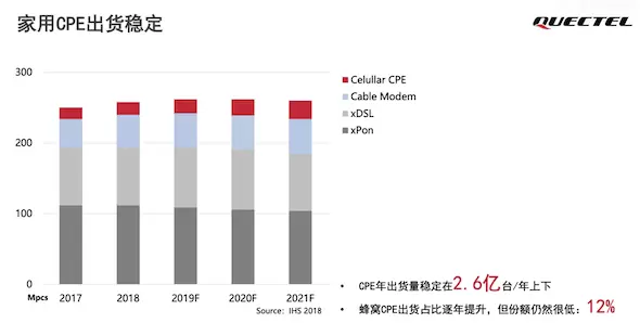 根据IHS 2018的数据显示,从2017年到2021年间,有线宽带设备出货量的增长微乎其微,而蜂窝CPE出货占比则逐年提升,尽管所占份额仅为12%,但提升空间仍不可限量。