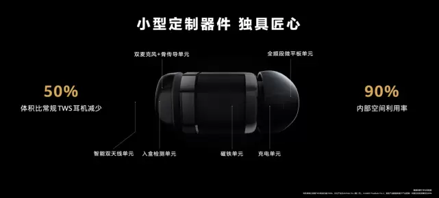 高集成设计的不仅是手表,其内置的无线耳机当然也不例外。华为WATCH Buds内置的耳机采用定制小型化精密器件,在极其有限的空间中内置六大单元,整体体积相比传统TWS耳机体积减少了50%,空间利用率更是达到了90%。单只耳机净重仅约4g[2],携带佩戴都轻若无物。