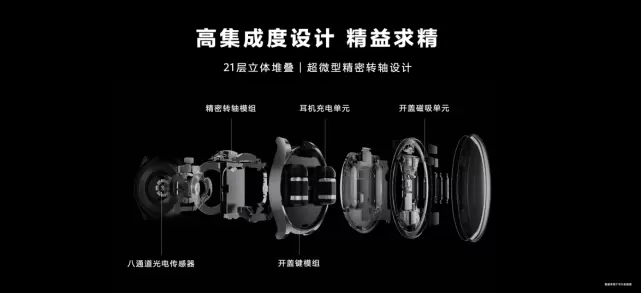如此高集成度整体架构设计,让华为WATCH Buds可以在有限的空间内放入更多的元器件。华为WATCH Buds机身厚度仅14.99mm,却塞入了多达21层结构的立体堆叠,包括八通道光电传感器、精密转轴模组、耳机充电单元、开盖磁吸单元、开盖键模组等,同时还嵌入了一对无线耳机。在材质方面,采用更薄的高强度锂铝硅玻璃,比WATCH GT3更薄,强度提升了25%。[1],手表内部结构在极致压缩空间的同时,仍然能让消费者体验强大的智能手表功能。