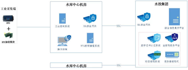 该方案综合采用SSL加密、数字证书、签名验签、动态密码等成熟的密码技术,实现了工业采集端数据的加密、水库工业控制系统本地机房管理端与服务器端数据传输加密,采集端设备接入水库中心机房、水库管理公司接入水投集团、系统用户登录应用系统的身份鉴别,以及数据库业务数据的安全存储以及系统所有设备的统一运维管理。