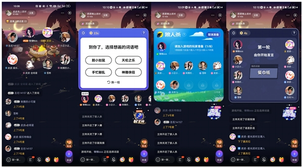 目前,在皮皮App线上派对内有8个语音麦位,用户可以自由选择自己的位置,通过语音其他人互动,在派对内用户可以一起聊天、唱歌以及一起玩一些聚会小游戏,随时随地都可以在茶话会、KTV、演唱会、游戏开黑等多种玩法当中切换。
