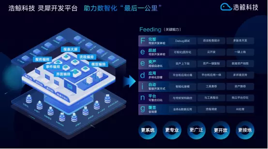 浩鲸科技基于云原生架构自研的创新性平台--灵犀开发平台,重新定义理想低代码产品标准特征,首次推出业内独家FEEDING标准模型核心能力,从开发模式、交付模式、开发组织和场景创新等方面提供了全新的云上体验,变革软件生产模式,让数智化能力快速触达业务的“最后一公里”,为企业转型提供低成本、普惠的快车道,快速实现业务创新和技术模式的升级。