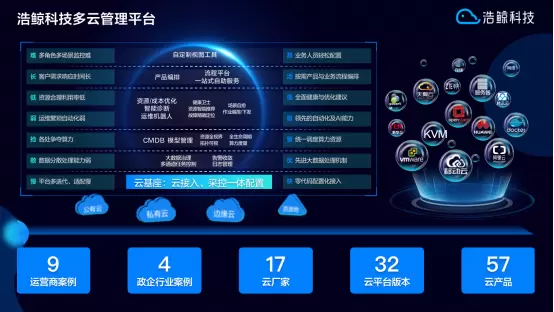 浩鲸科技云MSP综合解决方案为客户提供全栈全生命周期云服务,涵盖上云规划、架构设计、迁移运维、混合多云管理及运营的端到端产品服务,帮助客户将数据、应用、系统平滑迁移、快速部署到云端。AI赋能的多云管理平台工具,帮助云厂商及上云客户解决云内资源无法协同操作、云产品多类、运营流程断点、监控不全面、缺乏智能化管控手段、存量经营分析能力较弱等焦点问题,实现统一门户、一站式便捷管云,打造客户体验领先、云网一体智能高效运营平台,当前已携手中国移动在浙江、安徽、宁夏等多地帮助当地政务上云及多云管理,助推移动实现政企业务发展。